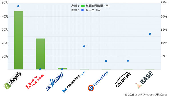 また、世界的にサービスを展開しているカート・PKGサービスのShopify、Adobe Commerceが40兆円、20兆円台で7・8番手に続いている。そして、マーケットプレイスの雄であるShopee、eBayが9・10番手になっており、ここまでの10サービスが10兆円をクリアしている状況だ。