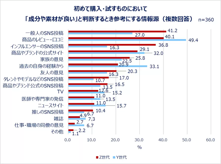 始めて商品を購入・試す場合、成分や素材が良いと判断するにはどのような情報源を参考にしているのか尋ねたところ、Z世代で多かったのは「一般人のSNS投稿(41.2%)」「インフルエンサーのSNS投稿(36.8%)」で、SNSをよくチェックしていることがうかがえる。一方、Y世代で特徴的だったのは「過去の自身の経験から」で3割以上が回答していた。また、「商品のレビュー・口コミ」は、Z世代が40.1%、Y世代が49.4%と共に比較的多くの人が活用していることが分かった。