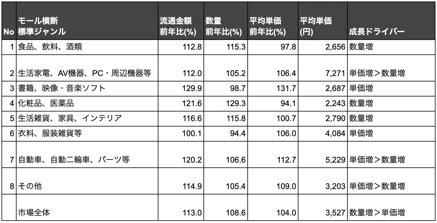 ジャンル別にEC市場の成長を見ていくと、「食品、飲料、酒類」での数量が増加していた。これはECでの購入が日常化したことによる「販売数量の増加」が大きく関わっていると考えられる。また、メーカーによる値上げはあったものの、消費者は比較的低単価の商品を選んで購入しているようだ。