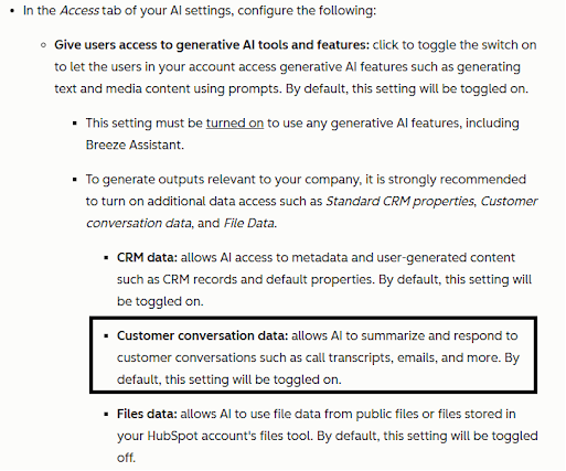 ベンダーは、ユーザーがデフォルトで有効化すべき機能を理解するためのサポートも提供できる。たとえば、HubSpotの「Breeze AI Assistant」はまだベータ版と表記されているが、HubSpotが新しいAI機能をリリースした際には、顧客との会話データがデフォルトで有効化されていた。通話記録やメールなど、可能な限り幅広いデータが対象だった。