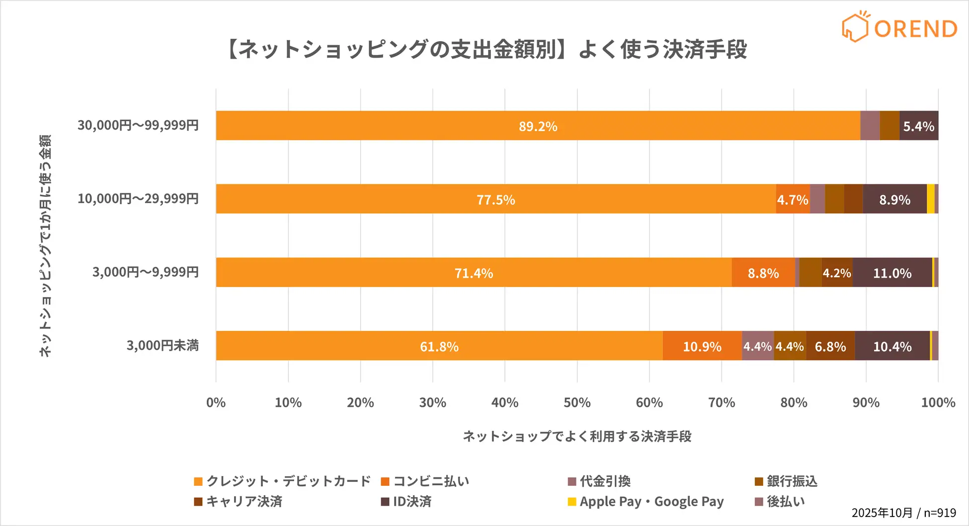 よく使う決済手段をネットショッピングの支出金額別に見ていくと、「3万円〜10万円未満」の層ではクレジットカード利用が8割近くを占めていたことから、高額な買い物では信頼性やポイント還元を重視する人が多いと考えられる。一方、「3,000円〜9,999円」の少額利用層では、ID決済やコンビニ払いの利用がやや多く見られた。これは、スマートフォンで手早く支払えることや、少額でも使いやすい点が評価されていることがうかがえる。このように、1か月あたりの支出金額によって、信頼性や還元率を重視するクレジットカード決済と、手軽さやスピードを重視するID決済・コンビニ払いが使い分けられていることが判明した。