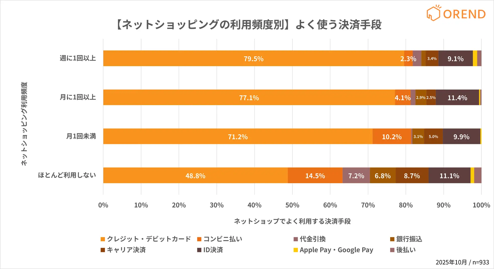 よく使う決済手段をネットショッピングの利用頻度別でみていくと、週1回以上利用する層では約8割がクレジットカードを使用しており、利用頻度が高い層ほどクレジットカード決済が定着してる傾向がうかがえた。その一方で、ほとんど利用しない層ではクレジットカードは約5割にとどまり、コンビニ払いや代金引換など現金系決済が多く使われていた。この結果の背景として、たまにしか使わない人には「オンラインでのカード情報入力に抵抗がある」「登録が面倒」といった心理があると推測される。