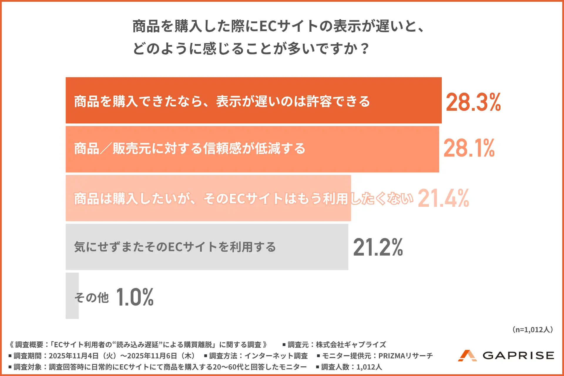 デジタルビジネス支援を行う、海外SaaS商社の株式会社ギャプライズは、日常的にECサイトにて商品を購入する20~60代の方を対象に、「ECサイト利用者の“読み込み遅延”による購買離脱」に関する調査を実施した。
