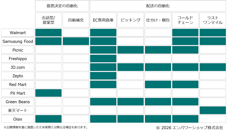 このように各社の取り組み状況を見てみると、まだまだ食品ECの自動化・高度化は発展の余地が多く残されていることが分かる。また、各社の現状の取り組み状況は、各社の出自となった業態にかなり影響を受けているようだ。
