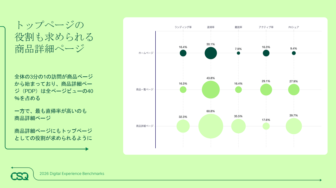 サイト訪問者のうち約30%が商品詳細ページからスタートし、商品詳細ページは全体の閲覧数の約40%を占めている。しかし、商品詳細ページからの直帰率も一番高く約60%となっていた。このことから、 多くの人が直接「商品ページ」に来ているものの、見てすぐ帰る人も多いため、これからの商品詳細ページはただの「説明ページ」ではなく、トップページの代わりとなる重要な役割を果たしていると言える。