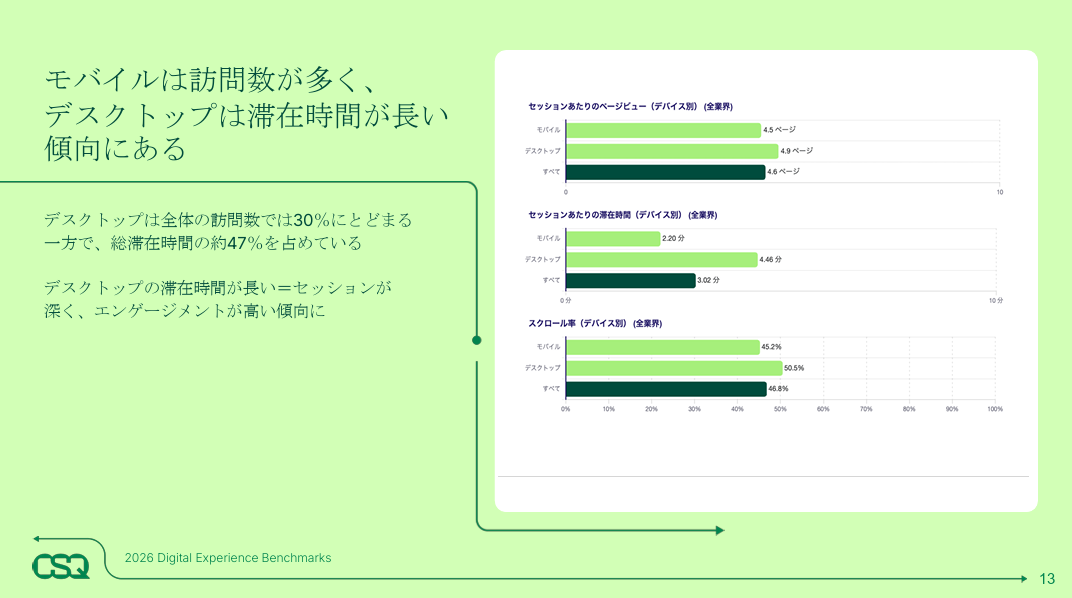 サイトへの訪問者を端末別でみていくと、モバイルは経由では訪問数が多めであるものの、ページをみている時間が短いという特徴があった。その一方、デスクトップは訪問数は全体の30%にとどまりそこまで多くは無いものの、サイトの滞在時間が長く、エンゲージメントが高い傾向となっていた。このことから、スマホからは集客向き、PCは検討向きといえるだろう。