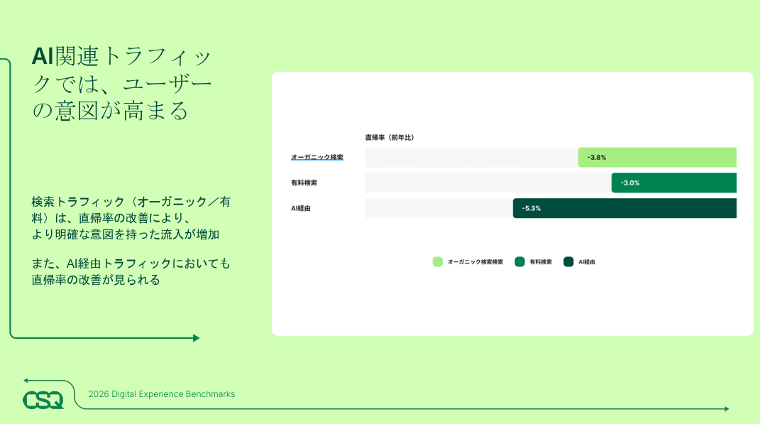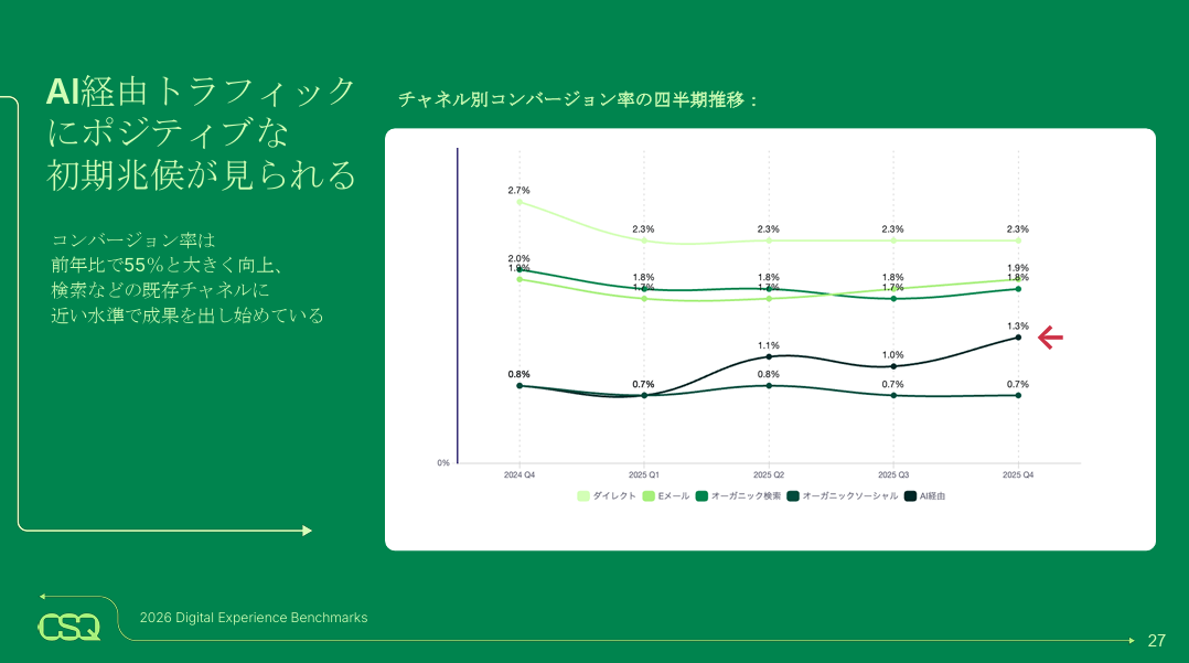 コンバージョン率は、前年比で55%と大きく向上していたものの、1位のダイレクトは減少傾向にあった。一方、AI経由の数値はまだ低めだが、右肩上がりで成長し、検索などの主力チャネルに少しずつ近づいていることが分かった。また現在、AI経由のユーザーは、調査・比較など検討層段階のユーザーが多いが、今後は購入直前ユーザーが増加し、AIが検索の代わりになる日もそう遠くはないだろう。