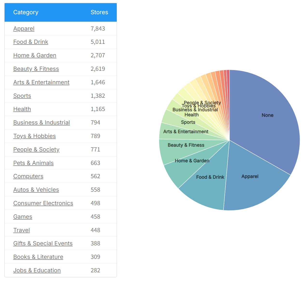 Store Leadsによると、日本国内におけるカテゴリ別稼働店舗数は、アパレルが全体の18.4%を占めており、次いで食品・飲料が11.7%、ホーム&ガーデン製品が6.3%を占めている。