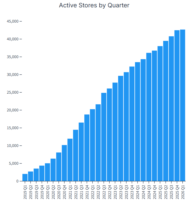 Store Leadsによると、日本国内のShopify導入店舗数は2025年第4四半期に前年同期比で16%増加し、2026年第1四半期現在の現役店舗数は43,073店舗である。サービス開始初期の2019年第1四半期には2,040店舗であった稼働店舗数は停滞することなく右肩上がりを維持して成長し、2025年第1四半期時点の導入店舗数である38,017店舗と比較すると前年比13.3%の増加率となる。