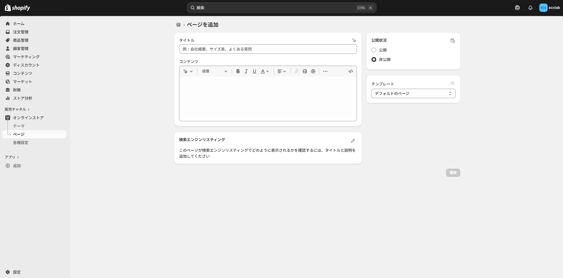 管理画面から「オンラインストア」>「ページ」>「ページを追加」をクリックすることで、ネットショップ運営に必要な特定商取引法に基づく表記に関するページを作成できる。この表記は、事業者と消費者の間でのトラブルを抑止するために明記することが法律で義務付けられており、会社概要やサイズ表に加えてプライバシーポリシーや返金ポリシー、配送ポリシーなどが含まれている。