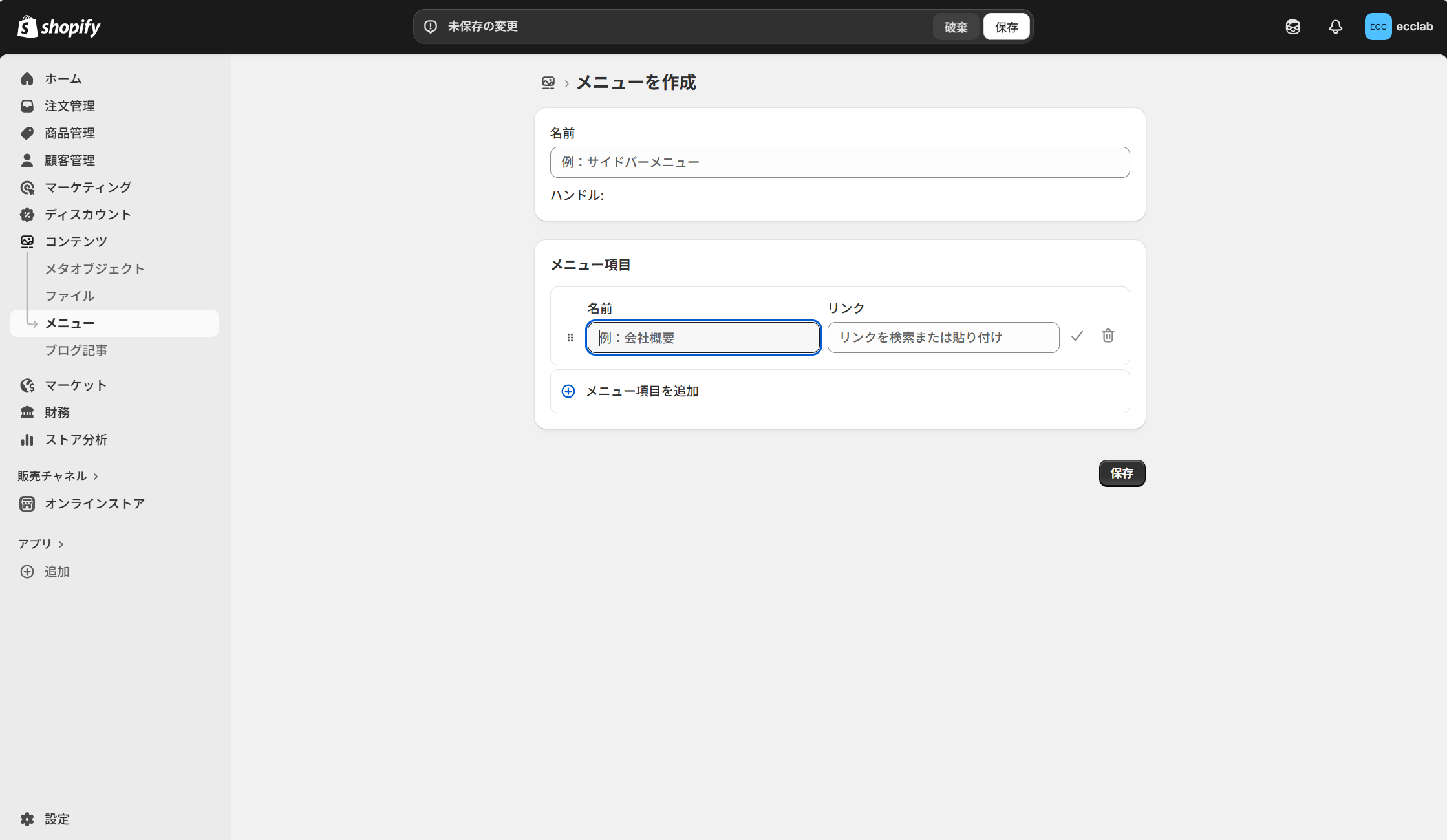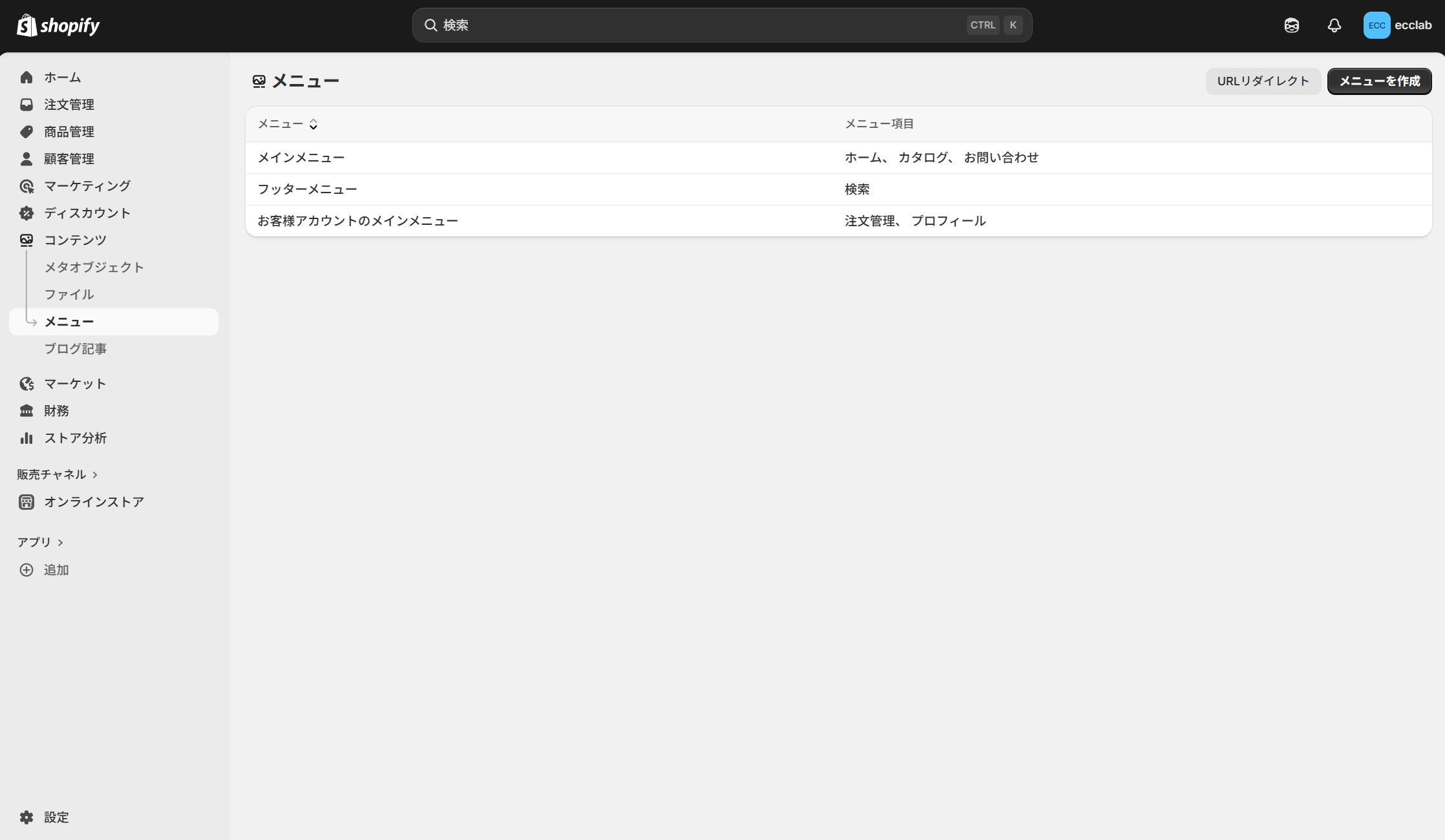 管理画面の「コンテンツ」>「メニュー」から「メインメニュー」や「フッターメニュー」を選択し、「メニューを作成」を押すと任意のメニュー作成のための入力欄が表示される。ここにメニューに表示させる際の項目名を入力し、リンクを設定すると作成したページへのリンクをメニュー上に表示できる。