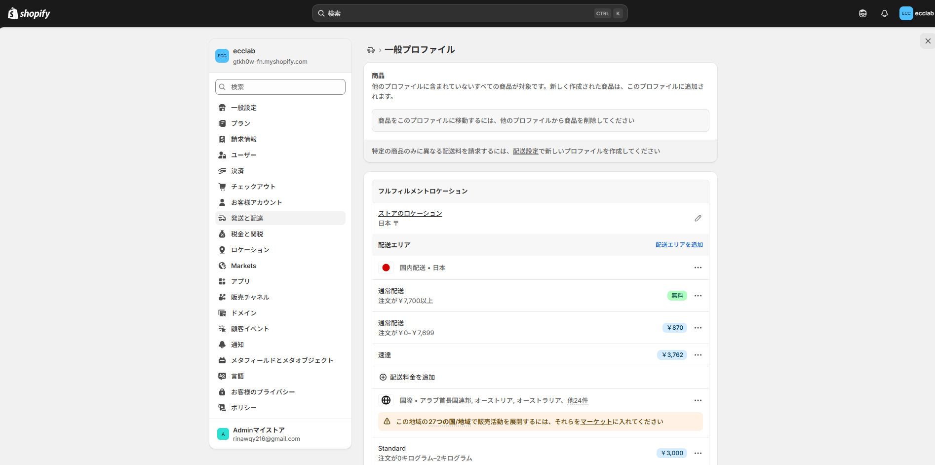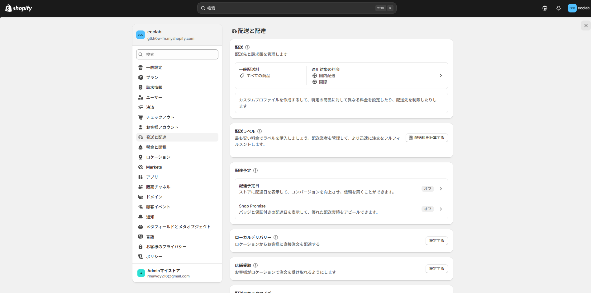 管理画面の「設定」の中から「発送と配達」を選択すると注文時に顧客画面に表示させる送料の設定ができ、配送エリアごとに異なる価格表示なども可能だ。Shopifyの場合、送料はデフォルトで全国一律に設定されているが、送料の高くなる北海道や沖縄など、地域別に送料を設定できる。