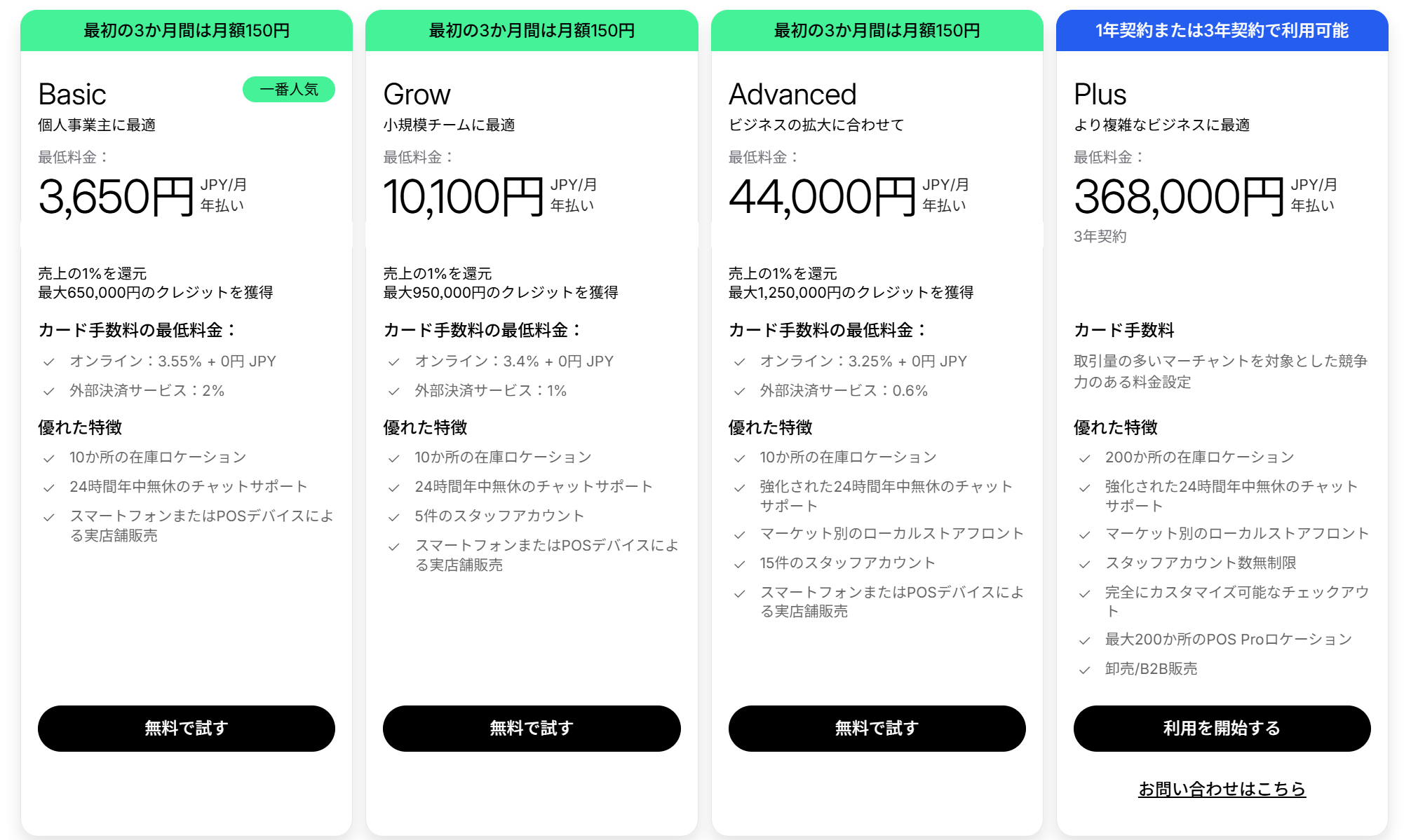 Shopifyは無料でのお試し期間が設けられており、その後3か月間は月額150円で利用可能だ。選べるプランは4種類あり、「Basic」「Grow」「Advanced」の3つの主要プランに加えて、より複雑なビジネスを行うチーム向けに1年契約または3年契約で利用可能な「Plus」が用意されている。