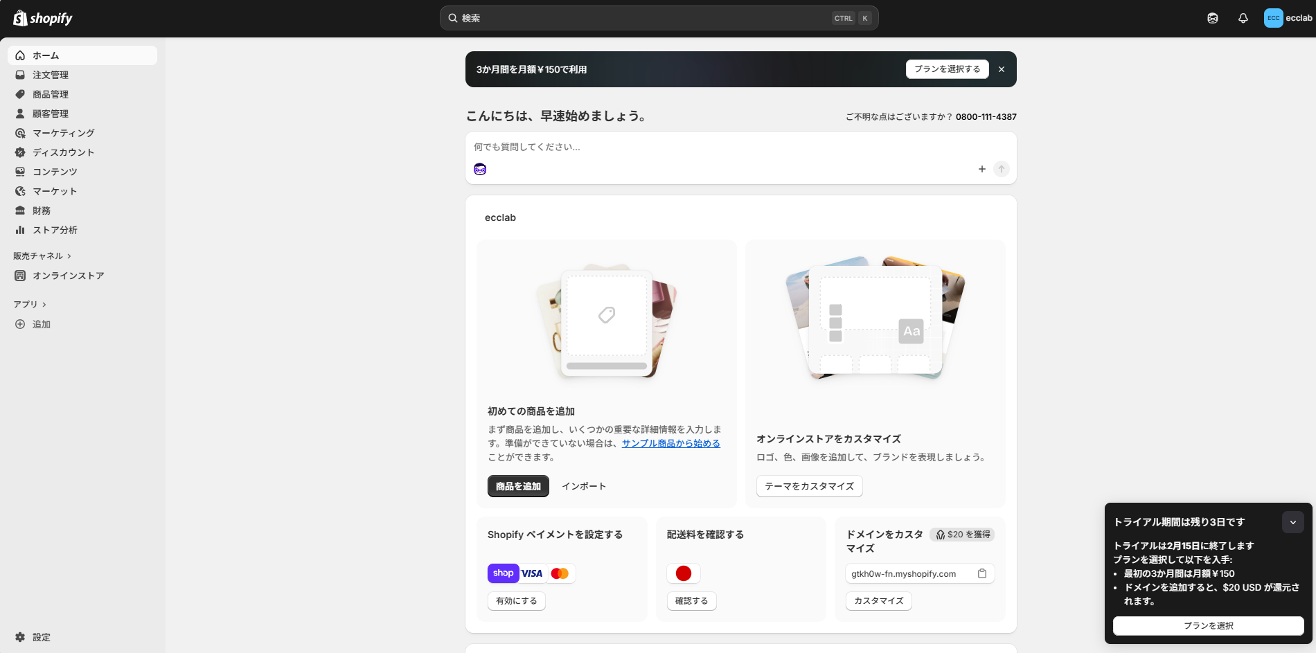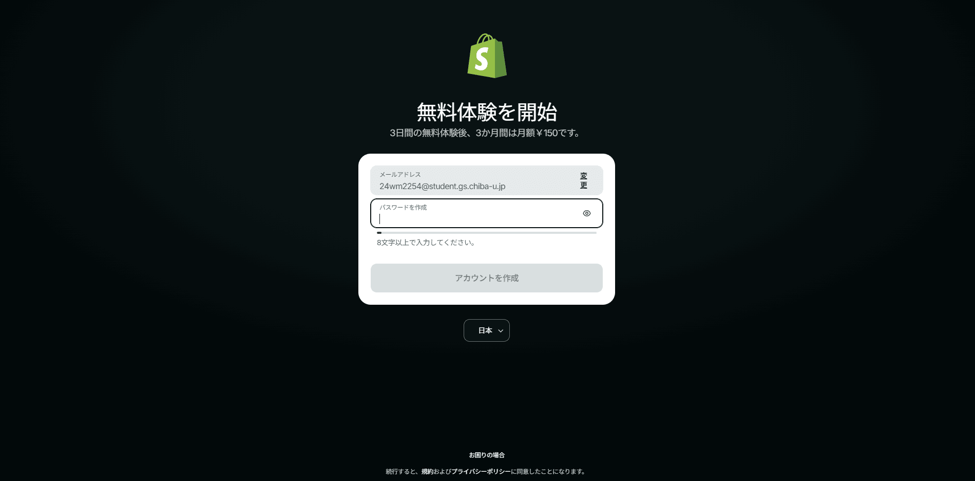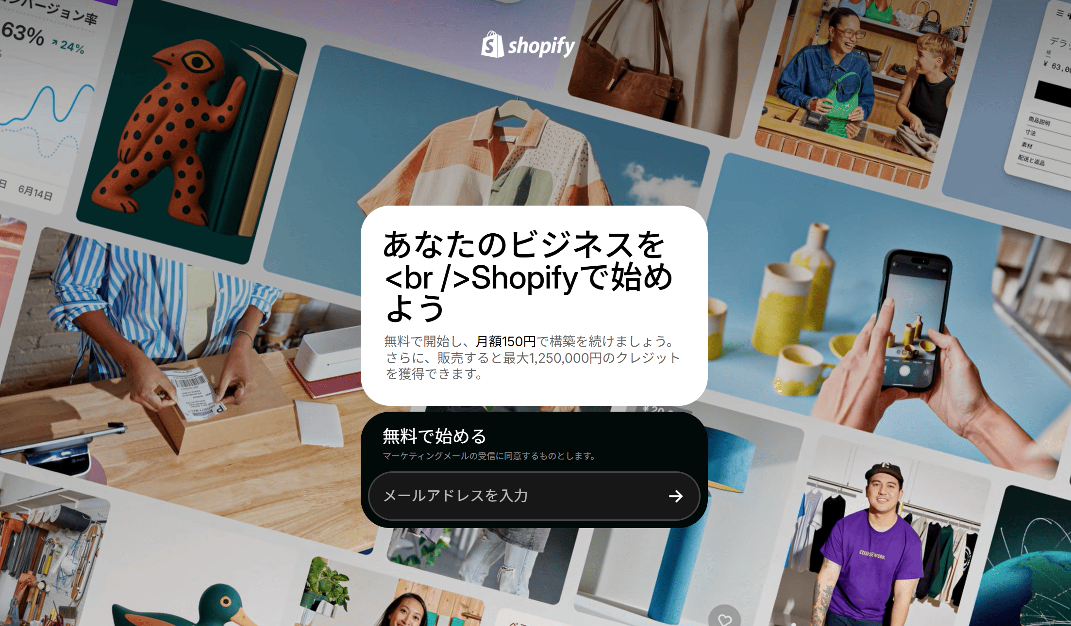 Shopify公式HPのトップページからShopifyアカウントの作成が可能となっている。任意のメールアドレスを入力すると、3日間の無料体験を始めることが出来る。アドレス入力後にパスワードを設定し、「Shopifyアカウントを作成」をクリックする。販売方法などに関する簡単なアンケートに回答し、「開始する」を押すとアカウント作成は完了だ。管理画面が開き、アカウント認証のため登録したアドレス宛に確認メールが届くようになっている。