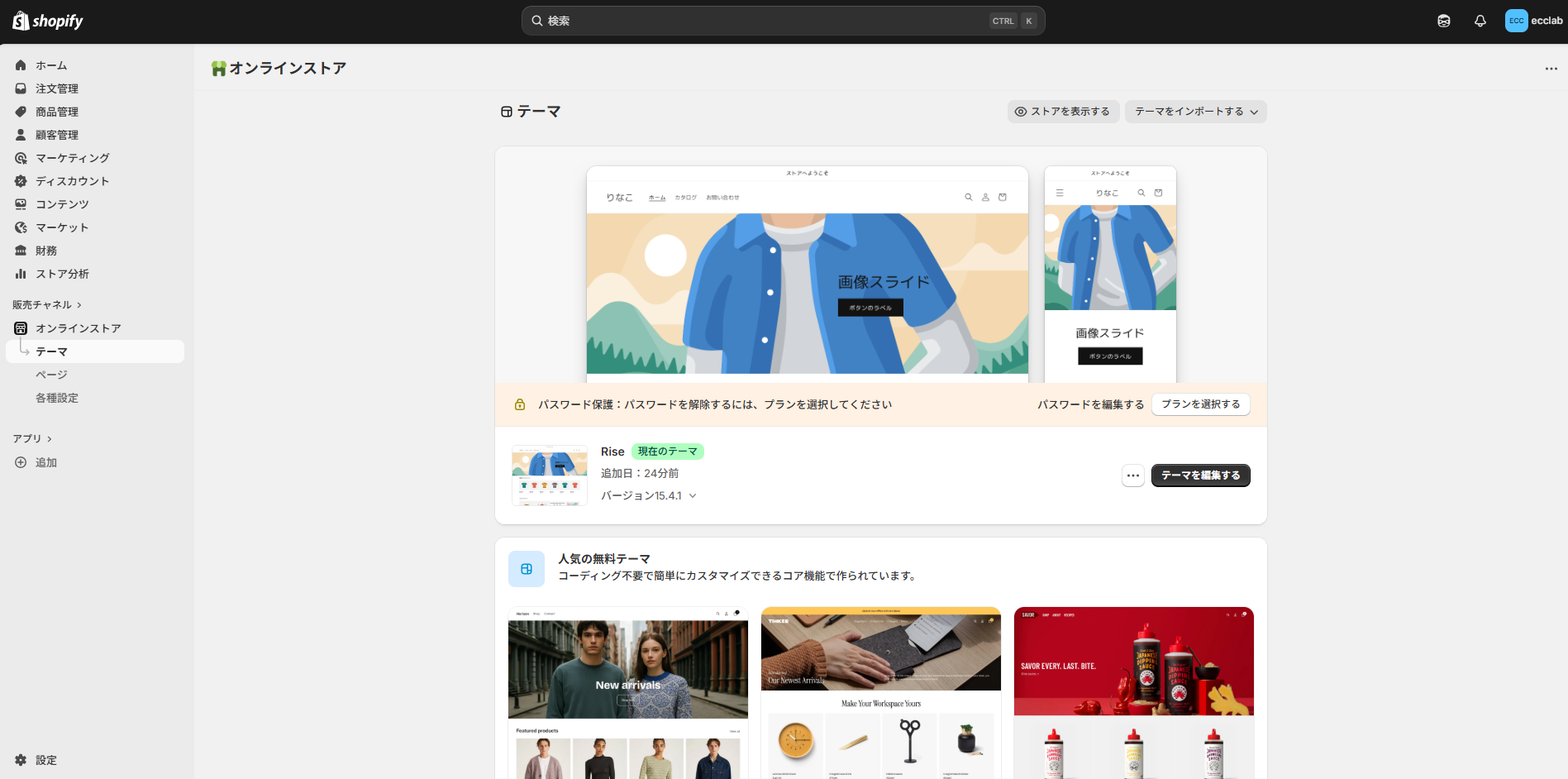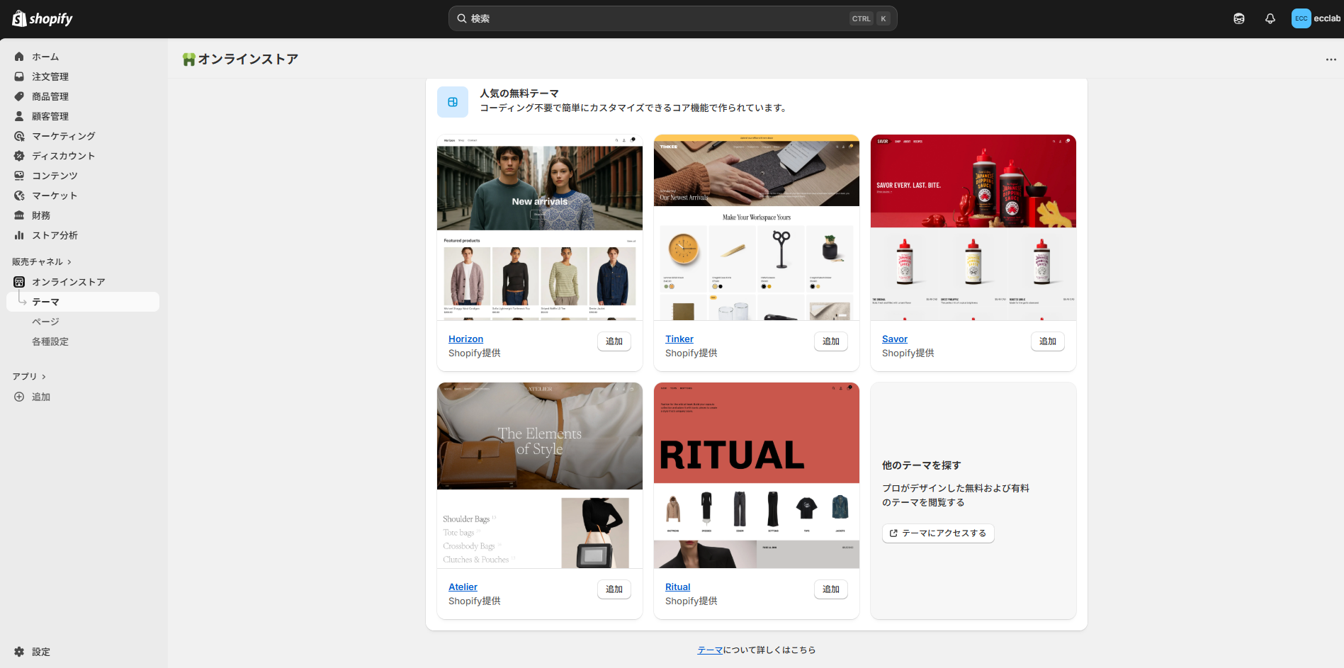 管理画面の「オンラインストア」>「テーマ」をクリックし、ショップのデザインを決定する。画面を下にスクロールすれば人気の無料テーマがいくつか紹介されており、これにより作成したECサイトのトップページから商品販売ページまで統一感のあるデザインを自動的に反映させることができる。Shopifyの魅力の1つである事前に用意された200以上のテンプレートにより企業ごとの雰囲気に合ったデザインを選択することができ、「カスタマイズ」をクリックするとテキストの変更やボタンの追加など微調整も可能である。