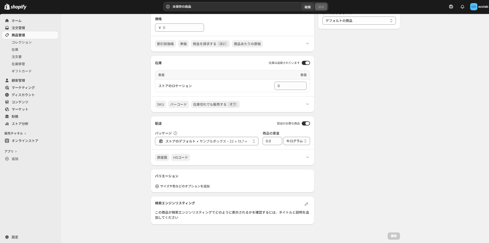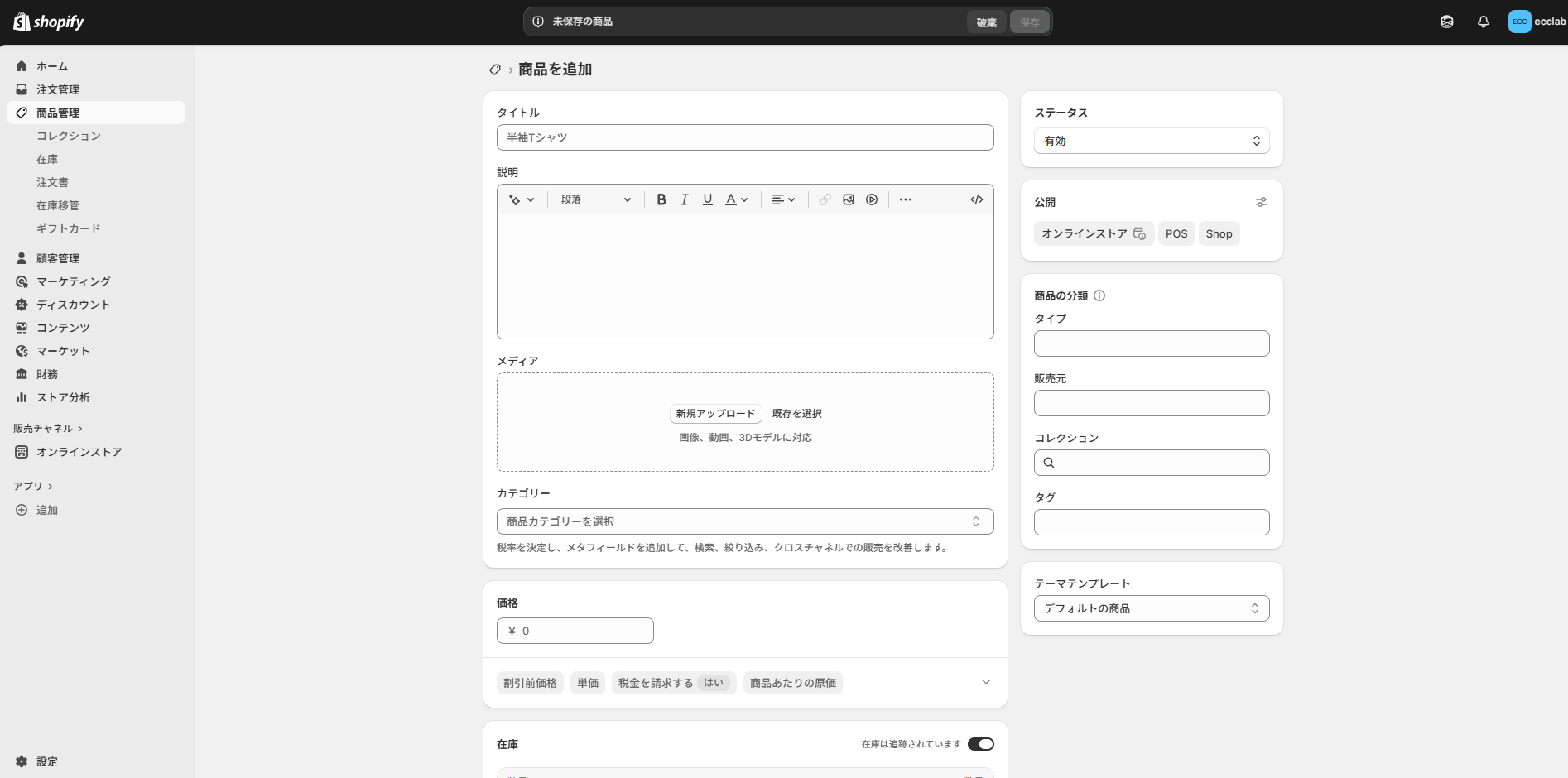 管理画面の左側メニューに表示された「商品管理」>「商品を追加」から商品情報を登録できるようになっている。「商品タイトル」、「説明」、「カテゴリー」、「公開中などステータス」、「画像や動画」、「価格」、「在庫」、「配送」、「サイズや色などのバリエーション」の入力項目から必要な情報を入力し、「販売チャネル」からステータスを公開中にして保存すると商品登録が完了する。利用者が商品を探しやすいようカテゴリ別に商品を登録する「コレクション」機能もあり、1つずつ手動で登録するほか、タグや価格の条件が一致するものを自動で追加していく設定も可能だ。さらに、在庫を追跡する機能を活用すれば完売に応じた在庫管理も自動化できる。