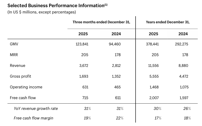 また、ShopifyのHPによると、数百万に上るマーチャントがShopifyで商品販売を行っており、これまでの累積売上合計額は1兆ドルを超えている。8四半期連続で25%以上の売り上げ成長率を達成し、2020年に比較すると3倍のGMVを記録しており、勢力を維持した拡大を続けている。また、2025年度第4四半期には、2024年同時期のGMVと比較し31%の売上成長率を記録しており、加えて10四半期連続で2桁のフリーキャッシュフローマージンを維持している。
