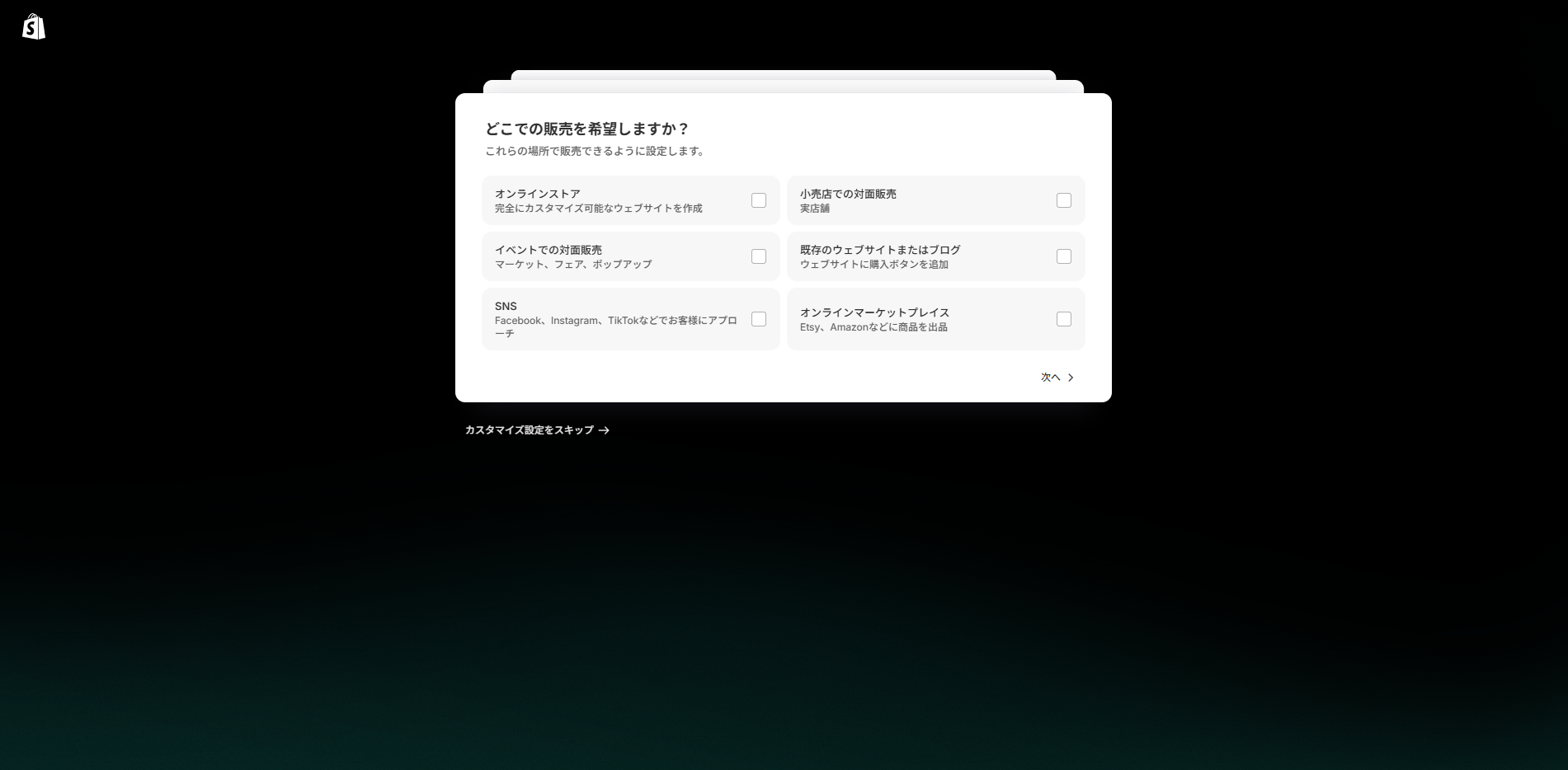 簡単なアンケートは、「販売形態」、「新規ビジネスか既存ビジネスか」、「販売予定の商品」、「ストア名」であり、これらの入力を済ませるかカスタマイズのスキップによりアカウント登録が完了するとメイン画面に遷移する。