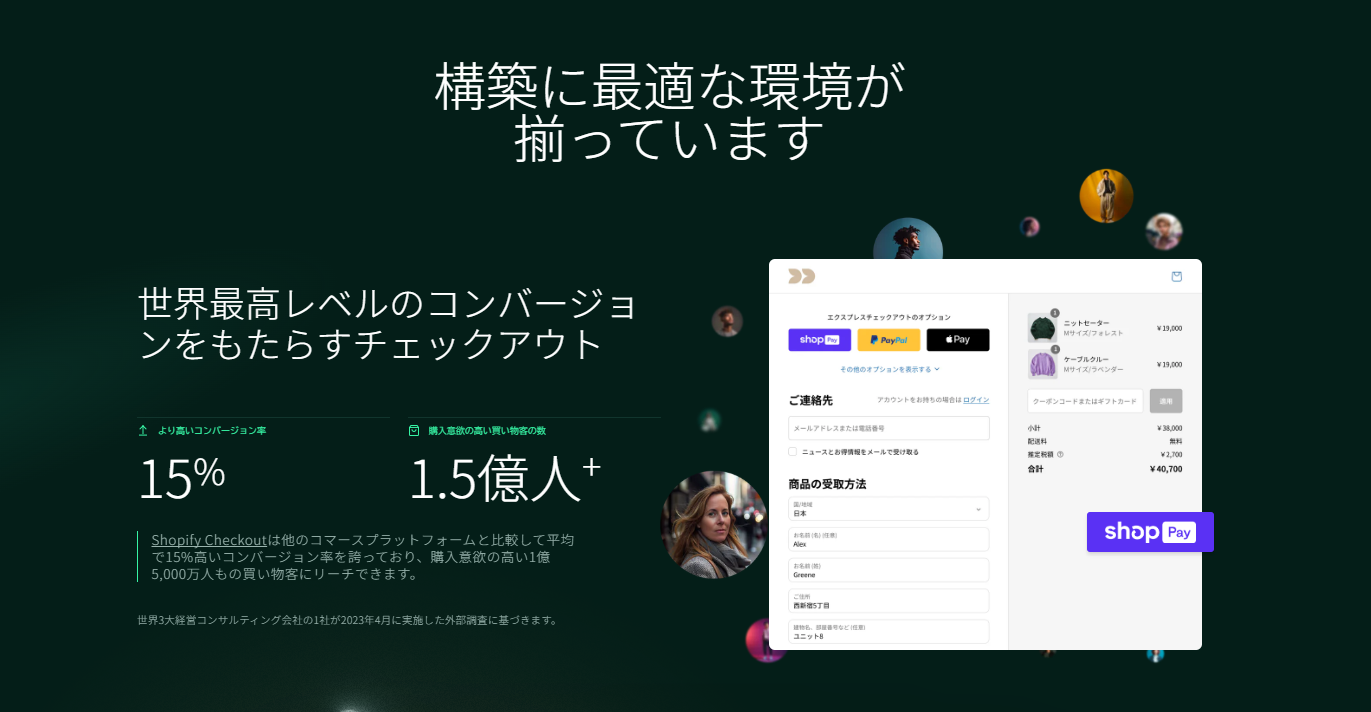 Shopify公式サイトより、2023年にShopifyストアから購入した買い物客は6億7,500万以上と報告されている。競合他社と比較して約15%上回る高いコンバージョン率を誇っており、中でも購入意識の高い買い物客1.5億人以上にリーチ可能とのこと。