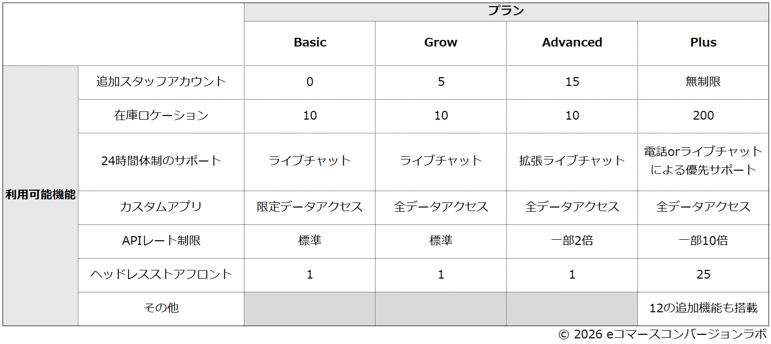 Plusプランではチェックアウトのカスタマイズ機能や大規模取引向けチェックアウト対応など、Plusプラン限定の追加機能がサイト内に記載されているもので12種類搭載されているため、他のプランとは大きく異なるものと考えた方が良いだろう。