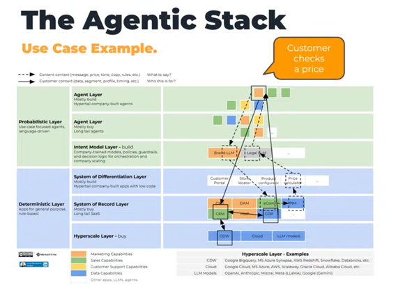 エージェント・スタックでは、同じリクエストが協調的な意思決定へと変換される。エージェントは、システム・オブ・レコードから価格設定ルール、商品制約、契約上の合意事項を取得すると同時に、顧客の行動、タイミング、チャネル、プロファイルといったコンテキストも評価する。