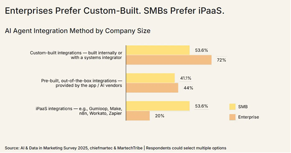 中小企業やスケールアップ企業は、マーテックとAIを最も積極的に導入する傾向がある。これらの企業は、成長を促進するためにツールに依存しており、これは相対的に高いマーテック支出と統合アプローチの両方に反映されている。