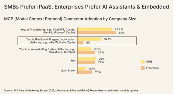 中小企業の半数以上(53.6%)が、システム接続にZapier、Make、n8nなどのiPaaSソリューション(クラウド上で複数のアプリやシステムをつなぎ、自動化するためのサービス)を利用している。これは、大企業におけるわずか20%と比較して高い割合だ。また、中小企業はアクセスしやすいエントリーポイントを通じてAIを導入しており、32.1%がiPaaSまたは自動化プラットフォームを介してエージェントを統合している。これは、大企業におけるわずか8%と比較して高い割合だ。これにより、迅速な実験が可能になるが、ビジネスロジックが複数のツールやワークフローに分散されるという課題も生じる。