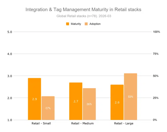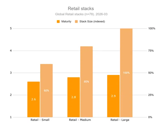 全体的な成熟度は企業規模とともに高まる。小規模小売業者の平均成熟度は2.6、中規模小売業者は2.8、大規模小売業者は2.9となっている。スタックの規模も同様に拡大しており、小規模企業では大規模小売業者のスタックの約60%程度にとどまるのに対し、エンタープライズ環境ではフルスケールで導入されている。