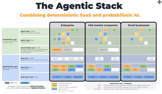 データによると、企業はSaaSをAIに置き換えているわけではない。むしろ、依然として業務を支えている決定論的なSaaSシステムの上に、確率論的なAIを重ねて導入している。課題は、システムの断片化や制御の喪失を招くことなく、これらを連携させることにある。エージェント・スタックはそのためのモデルを提供するものであり、その構成は企業の規模によって大きく異なる。
