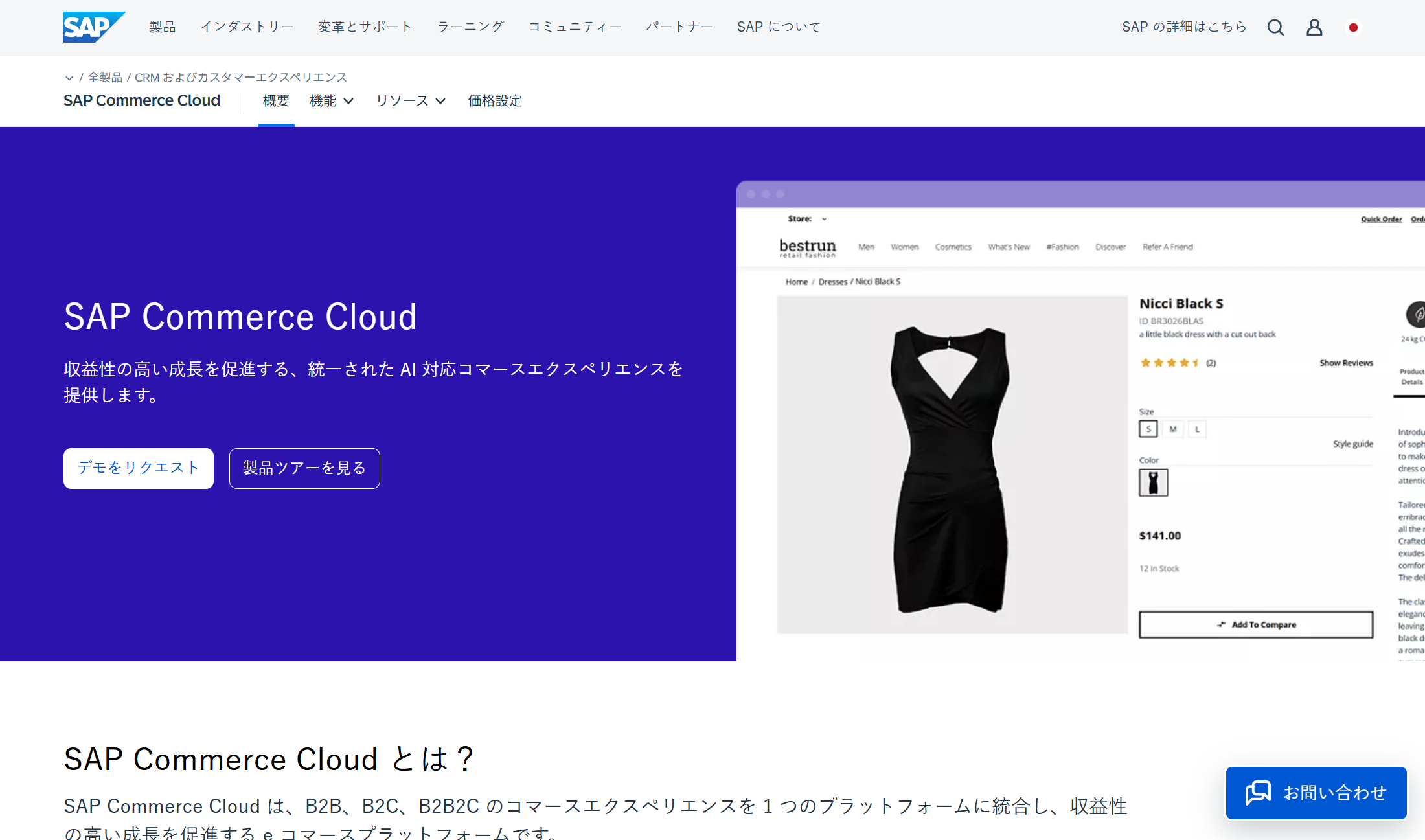 SAPジャパンが運営するSAP Commerce Cloudは、多言語・他通貨対応でグローバルに活用したい大企業向けのコマースソリューションで、社内全体のデータを活用することで利益を上げつつ、顧客満足度も高められる。主にB2B、B2C、B2B2C、D2C、その他様々なビジネスモデルに対応できるよう構築されており、非常に複雑なカタログや商品情報などの管理が可能である。これにより、適切に一人一人に合わせたオムニチャネルエクスペリエンスを創出することが可能となっている。また、機能としては、AI を活用した「顧客ごとに最適化した対応を即座に行う」、「レコメンデーション」、「商品企画」等があり、顧客やビジネスにとって価値のある製品・サービスの販売促進を行っている。このような豊富な機能を備えた拡張性の高い信頼できるプラットフォームを使用することで、柔軟性があるコマース体験を提供し、高い収益性を実現している。さらに上記のサービスに加え、製品情報管理ソリューションも提供しているため、高度なサービスを求める事業者は一度検討してみるといいだろう。
