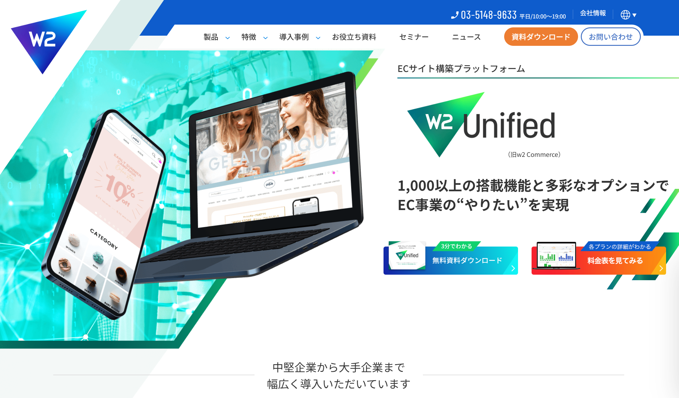 W2株式会社が提供しているデータの統合管理を通じてオンラインとオフラインの垣根をなくした購買体験を実現するSaaS型ECプラットフォームの「W2 Unified」は、商品登録・受注管理・決済機能など基本的なECカート機能から354%のEC売上成長率と、90%の業務工数削減を実現する機能まで業界Topクラスの1,000以上機能を搭載している。また、OMO施策が得意なこのサービスでは、店舗受取(BOPIS)、ライブコマース、SNSショッピング連携、POS連携、モール商品・在庫連携といった機能が装備されている。さらに、W2独自のインフラ環境では、セール実施時やSNSを活用した際の瞬間アクセス数増加に対して、アクセス数上限の領域を拡張することが可能なため、サイトがダウンしないよう回避することができる。他にも特徴として、「複数のブランドサイトを1つのシステムで一元して管理することができる」点が挙げられ、情報を1つにまとめて確認できることで、各サイトを横断したマーケティング施策の実施や、運用管理の効率化を実現する。
