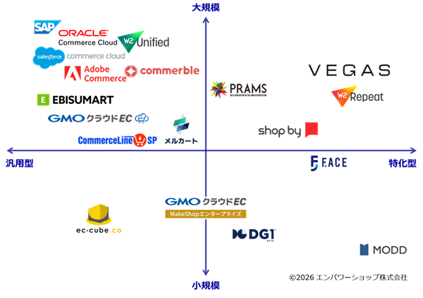 より大規模なクラウド型EC構築パッケージには「SAP Commerce Cloud」や「Oracle commerce cloud」、「W2 Unified」、「Salesforce Agentforce Commerce」が挙げられる。これらに次いで大規模なクラウド型EC構築パッケージには「Adobe commerce」や「commerble EC PaaS」、「VEGAS」、「PRAMS」などが挙げられる。