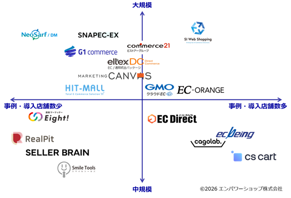 より大規模なECサイト構築パッケージには「SNAPEC-EX」や「Neosarf」、「SI Web Shopping」が挙げられる。これらに次いで大規模なECサイト構築パッケージには「G1 commerce」や「Commerce21」、「eltexDC」、「TIS MARKETING CANVAS」などが挙げられる。